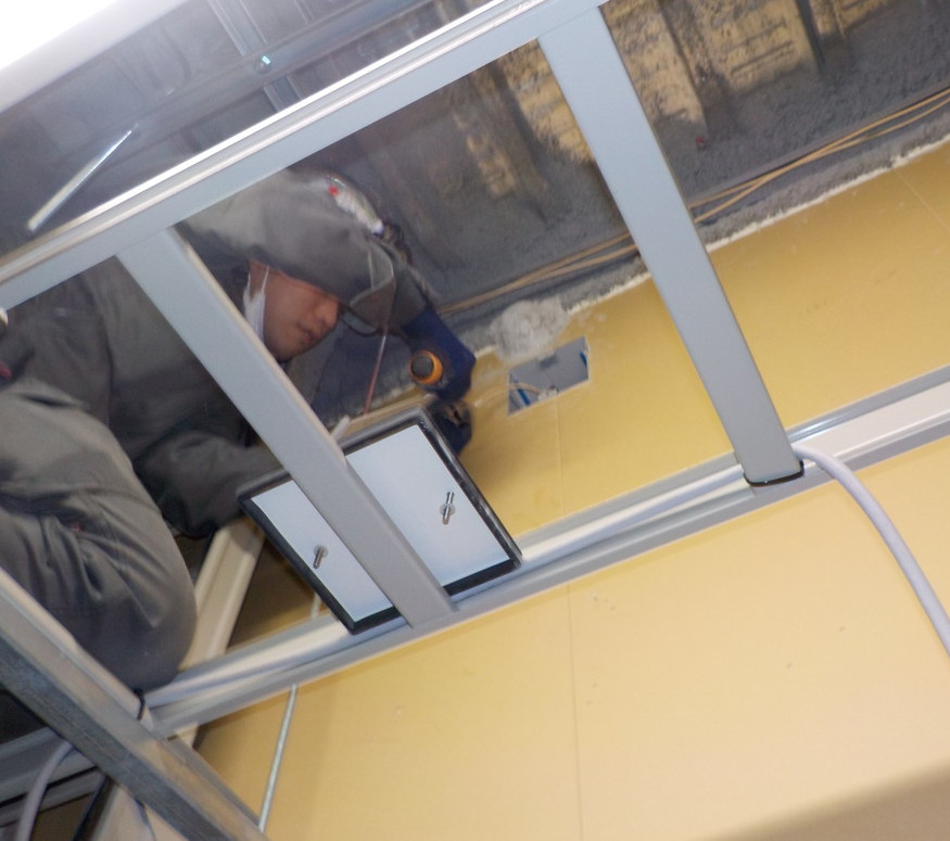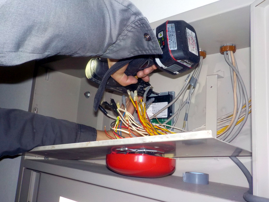 エレベーターに設置されている感知器を交換中。