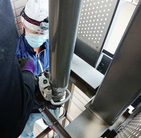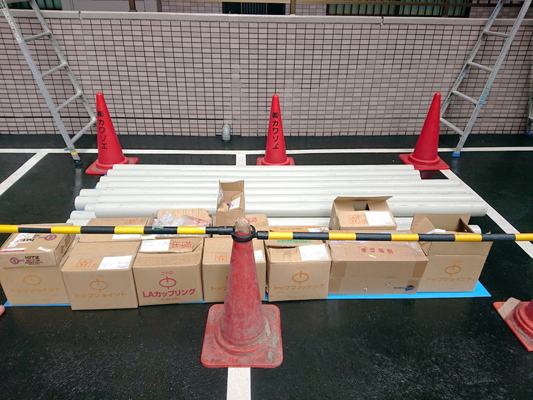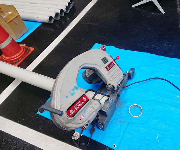 資材のパイプの加工から始めます。比較的騒音が少ない機材です。