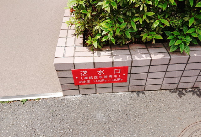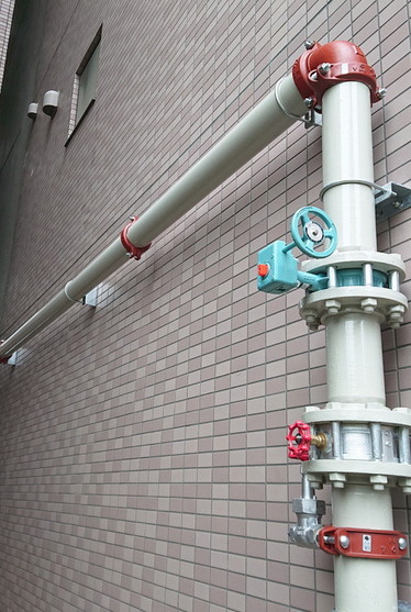 消防隊が、建物内部で消火活動するための連結送水管。建物の外側に設置された「送水口」からポンプ車を接続して、建物内部へ水を送り込み、内部でホースから放水できる…という仕組みです。