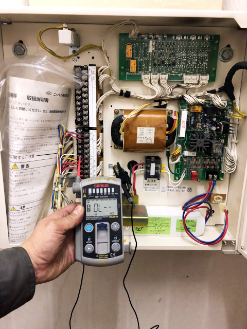 非常用警報機の本体内部です。この日も無事点検を終えることができました。