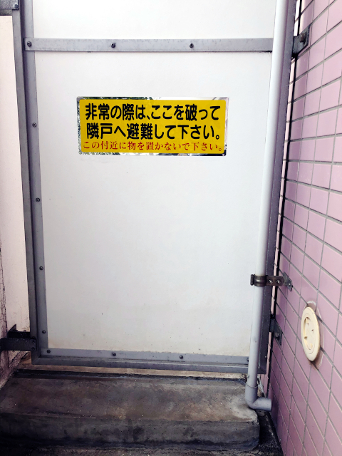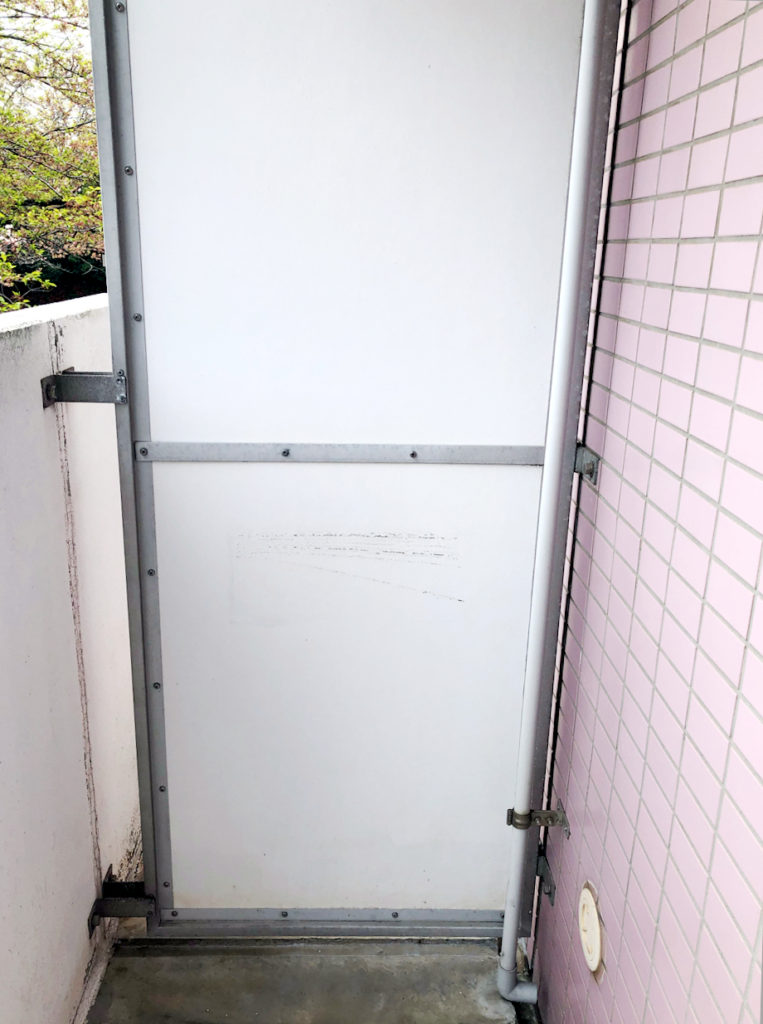 ベランダの蹴破り(けやぶり)戸。非常時にここをけ破ることで、避難経路を確保できるものです。「パーティション」「隔て」など呼び名はさまざまですが…