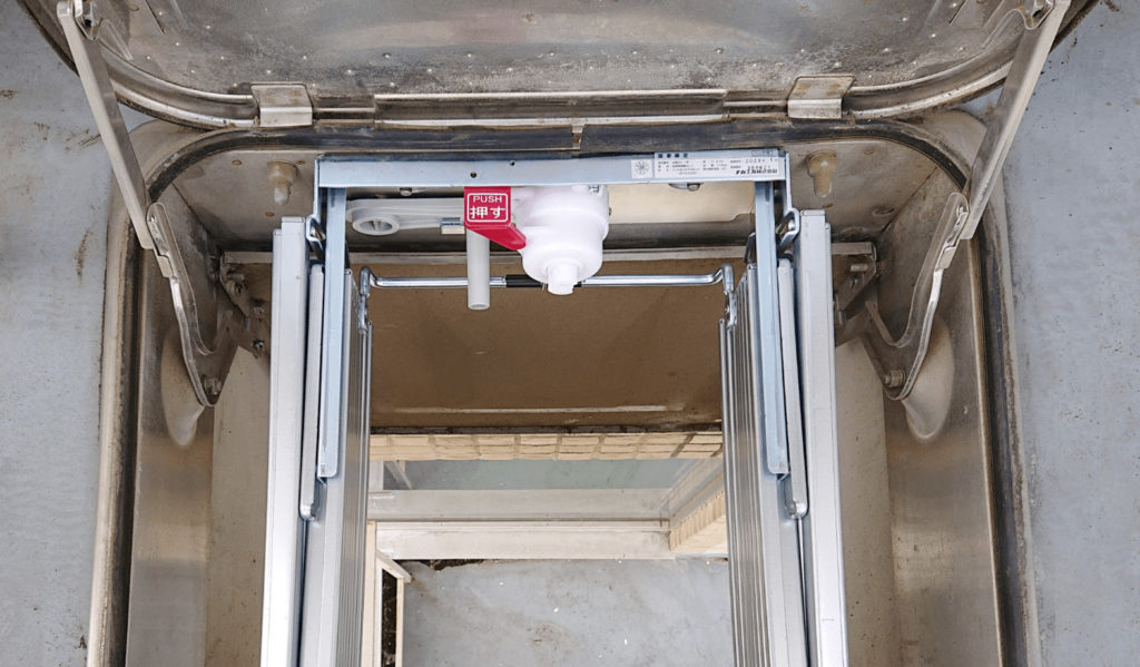 避難ハッチの製品には様々なものがありますが、同じ製品があれば今回のようにハシゴの部分の交換で済みます。古い建物はスチール製が多く、発錆(金属がさびる)してしまい、外枠ごと交換になることが多くなっています。