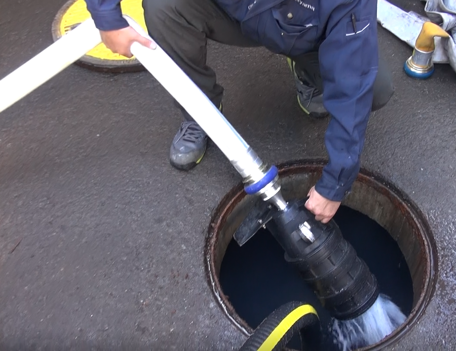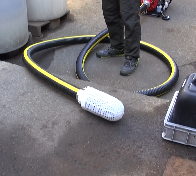 消火水槽の近くへ運び、水をポンプがくみあげて圧送し、消火ホース側から放水。