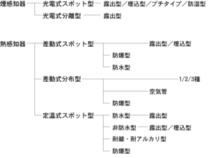 本日は感知器についてご説明します。感知器とは、火災により生ずる熱または火災により生ずる燃焼生成物(煙)を利用して自動的に火災の発生を感知し、火災が発生した旨の信号「火災信号」または火災によって生ずる熱もしくは煙の程度、その他の火災の程度に係る信号「火災情報信号」を受信機に発信するものをいいます。感知器にはたくさんの種類があります。(下図参照ください。)