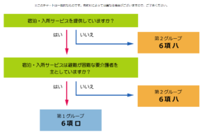まず、宿泊・入所サービスを提供しているか、している場合は、宿泊・入所サービスは避難が困難な要介護者を主としているか、していれば、平成30年3月31日までに原則スプリンクラー設備の設置が必要となります。また、当てはまらない場合であっても、避難が困難な要介護者を主とする施設は、対象となりますので、注意が必要です。避難が困難な要介護者を主とする宿泊・入所施設とは、介護保険法に定める要介護区分が3以上の者の割合が定員の半数以上の施設を指します。